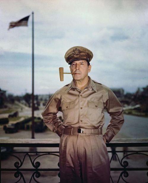 二战爆发后,麦克阿瑟被任命为西南太平洋战区的司令。在他的领导下,美军在太平洋战场上取得了辉煌的胜利。麦克阿瑟年轻时的照片中,我们可以看到他站在战舰甲板上,指挥着战斗,那坚定的眼神仿佛能穿透时空。